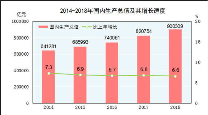 初步核算,2018年國內(nèi)生產(chǎn)總值900309億元,比上年增長6.6%。其中,第一產(chǎn)業(yè)增加值64734億元,增長3.5%;第二產(chǎn)業(yè)增加值366001億元,增長5.8%;第三產(chǎn)業(yè)增加值469575億元,增長7.6%。第一產(chǎn)業(yè)增加值占國內(nèi)生產(chǎn)總值的比重為7.2%,第二產(chǎn)業(yè)增加值比重為40.7%,第三產(chǎn)業(yè)增加值比重為52.2%。全年最終消費(fèi)支出對國內(nèi)生產(chǎn)總值增長的貢獻(xiàn)率為76.2%,資本形成總額的貢獻(xiàn)率為32.4%,貨物和服務(wù)凈出口的貢獻(xiàn)率為-8.6%。人均國內(nèi)生產(chǎn)總值64644元,比上年增長6.1%。國民總收入896915億元,比上年增長6.5%。全國萬元國內(nèi)生產(chǎn)總值能耗比上年下降3.1%。全員勞動(dòng)生產(chǎn)率為107327元/人,比上年提高6.6%。