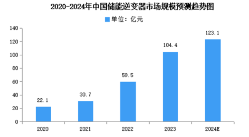 近年來,我國儲能市場呈現(xiàn)出高速增長態(tài)勢,催生對于儲能逆變器的巨大需求,儲能逆變器市場前景廣闊, 2022年中國儲能逆變器市場規(guī)模約為59.5億元,同比增長93.81%,2023年約為104.4億元。2024年市場規(guī)模將超過120億元。