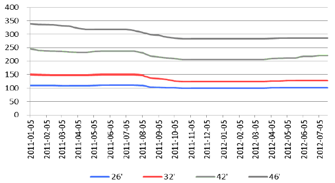 2011年下半年,受上游供給大量增加影響,面板價(jià)格出現(xiàn)8-12%的價(jià)格下滑。至2012年,面板價(jià)格已下滑至成本價(jià)左右。伴隨著日資和臺(tái)資面板廠商的虧損,面板企業(yè)相應(yīng)減少產(chǎn)能。2012 年4 月開(kāi)始,主流尺寸面板,價(jià)格開(kāi)始呈現(xiàn)攀升趨勢(shì)。特別是42 寸面板,價(jià)格相比年初上升7%。