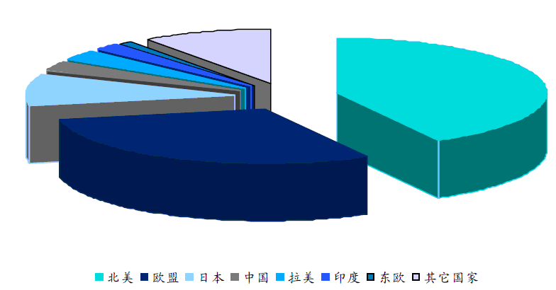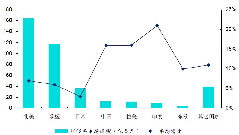 根據(jù)分析師市場(chǎng)報(bào)告,2008年北美、歐盟、日本占據(jù)著全球體外診斷市場(chǎng)份額的80%以上,市場(chǎng)分布不均,雖然我國(guó)體外診斷市場(chǎng)得到一定的發(fā)展,但是僅占全球市場(chǎng)份額的3%,且人均使用量?jī)H為1.5美元,較發(fā)達(dá)國(guó)家人均使用量的25-30美元還具有很大的成長(zhǎng)空間。