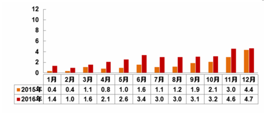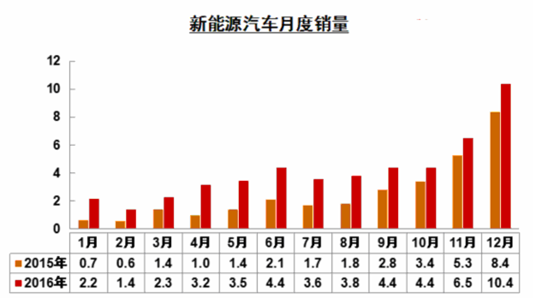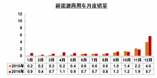 2016年新能源汽車市場跌宕起伏,但總體還屬于健康狀態(tài),雖然2016年增幅不及2015年,但低增速并不意味著行業(yè)發(fā)展不健康。從新能源汽車的月度銷量來看,2016年新能源汽車的月度銷量是逐月上升的。尤其是對新能源商用車來說,12月銷量為5.7萬輛,比新能源乘用車的銷量提升更為明顯,這與國家政策的出臺時機有很大關系。