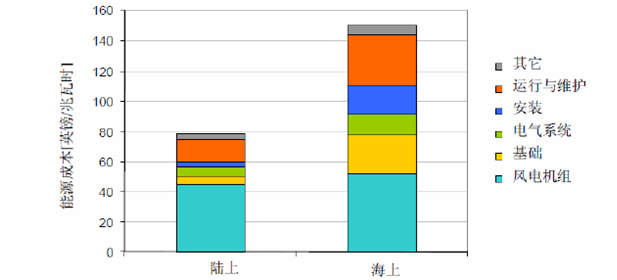 在度電成本上,海上風(fēng)電高出陸上約80%~90%,主要差別就在于基礎(chǔ)、安裝與運行維護(hù)的成本之上。