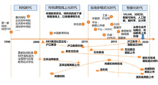2000-2010 年,隨著互聯(lián)網(wǎng)在中國的成熟以及國家對遠(yuǎn)程教育的支持,網(wǎng)校開始出現(xiàn),視頻課件、學(xué)習(xí)社區(qū)逐漸成為新的學(xué)習(xí)模式。2000 年出現(xiàn)三分屏課件,學(xué)生可以同時觀看教學(xué)視頻、授課課件以及課程綱要;2000年新東方網(wǎng)校上線,2009 年滬江網(wǎng)校上線,網(wǎng)校通常采用錄播授課的形式,學(xué)生可以根據(jù)自身的時間安排,通過互聯(lián)網(wǎng)觀看教師的授課內(nèi)容,傳統(tǒng)的線下培訓(xùn)教育開啟了互聯(lián)網(wǎng)教育模式。