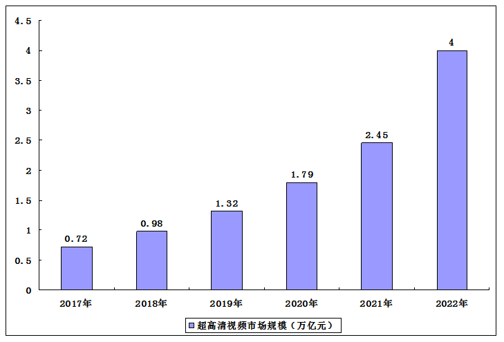 中國超高清視頻市場發(fā)展?jié)摿Υ螅陙硪恢背尸F(xiàn)增長趨勢。超高清視頻市場規(guī)模從2017年的0.72萬億元增長至2020年的1.79萬億元,年均復(fù)合增長率達(dá)35.47%。根據(jù)國家超高清視頻產(chǎn)業(yè)規(guī)劃,我國超高清視頻產(chǎn)業(yè)規(guī)劃總體規(guī)模將在2022年超過4萬億。