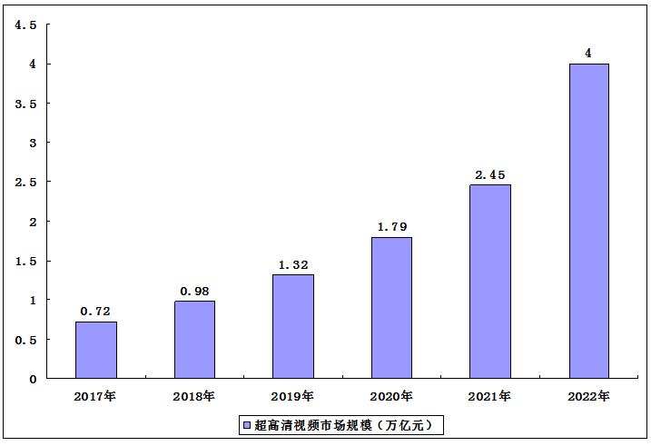 中國(guó)超高清視頻市場(chǎng)發(fā)展?jié)摿Υ,近年?lái)一直呈現(xiàn)增長(zhǎng)趨勢(shì)。超高清視頻市場(chǎng)規(guī)模從2017年的0.72萬(wàn)億元增長(zhǎng)至2020年的1.79萬(wàn)億元,年均復(fù)合增長(zhǎng)率達(dá)35.47%。根據(jù)國(guó)家超高清視頻產(chǎn)業(yè)規(guī)劃,我國(guó)超高清視頻產(chǎn)業(yè)規(guī)劃總體規(guī)模將在2022年超過4萬(wàn)億。