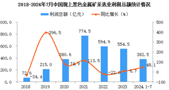 2024年1-7月,全國(guó)規(guī)模以上黑色金屬礦采選業(yè)企業(yè)營(yíng)業(yè)收入3078.4億元,同比增長(zhǎng)18.1%;營(yíng)業(yè)成本2438.5億元,同比增長(zhǎng)18.8%;利潤(rùn)總額382.5億元,同比增長(zhǎng)48.1%。