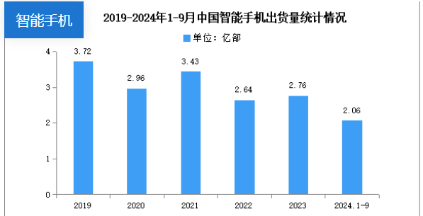 中國(guó)智能手機(jī)市場(chǎng)在近三年來(lái)一直持續(xù)走低,信通院數(shù)據(jù)顯示,2024年9月,智能手機(jī)出貨量2371.7萬(wàn)部,同比下降25.7%。2024年1-9月,智能手機(jī)出貨量2.06億部,同比增長(zhǎng)7.5%。