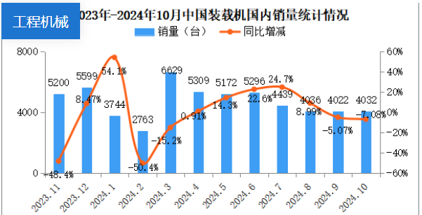 2024年10月銷售各類裝載機(jī)8355臺(tái),同比增長(zhǎng)11.1%。其中國(guó)內(nèi)銷量4032臺(tái),同比下降7.08%;出口量4323臺(tái),同比增長(zhǎng)36%。