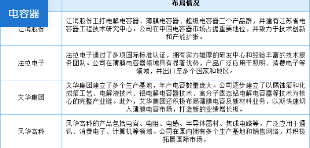 目前,電容器重點(diǎn)企業(yè)主要包括江海股份、法拉電子、艾華集團(tuán)、風(fēng)華高科、宏達(dá)電子。