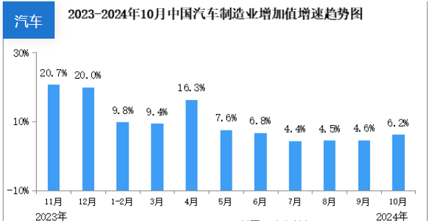 2024年10月,中國規(guī)上汽車制造業(yè)增加值同比增長6.2%,比上月提高1.6個百分點。2024年10月,中國規(guī)上汽車制造業(yè)增加值同比增長7.7%。