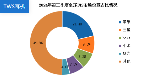 2024年第三季度,全球TWS市場中,蘋果依舊位居第一,市場份額達(dá)21.4%。其次分別為三星、boAt、小米、華為,市場份額分別為9.0%、8.2%、7.5%、4.0%。