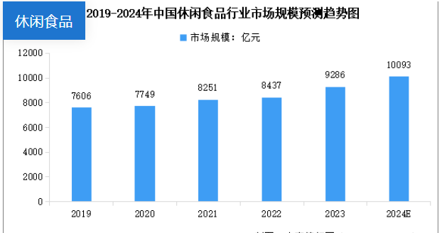 隨著生活水平的提高,休閑食品行業(yè)迅速發(fā)展,市場規(guī)模不斷擴(kuò)大。2023年中國休閑食品行業(yè)的市場規(guī)模達(dá)到9286億元,近五年年均復(fù)合增長率為5.12%。受人均可支配收入增長、消費(fèi)場景日益豐富、創(chuàng)新產(chǎn)品的不斷推出以及銷售渠道不斷拓展等因素所推動, 2024年中國休閑食品行業(yè)市場規(guī)模將達(dá)到10093億元。