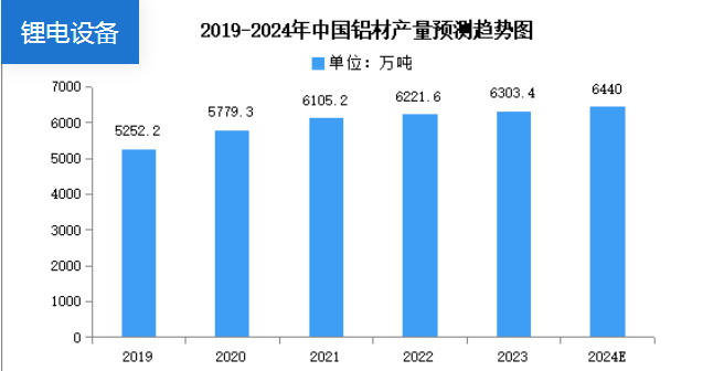 鋁材位于鋁產(chǎn)業(yè)鏈中游加工環(huán)節(jié),上游為電解鋁和再生鋁生產(chǎn),再生鋁或電解鋁添加合金元素后,通過(guò)擠壓、延壓等形式加工成鋁型材、板帶箔等。2023年中國(guó)鋁材產(chǎn)量達(dá)6303.4萬(wàn)噸,同比增長(zhǎng)5.7%。2024年中國(guó)鋁材產(chǎn)量將達(dá)到6440萬(wàn)噸。