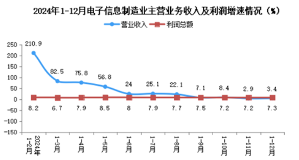 2024年,規(guī)模以上電子信息制造業(yè)實現(xiàn)營業(yè)收入16.19萬億元,同比增長7.3%;營業(yè)成本14.11萬億元,同比增長7.5%;實現(xiàn)利潤總額6408億元,同比增長3.4%;營業(yè)收入利潤率為4.0%,較1-11月提高0.04個百分點。12月份,規(guī)模以上電子信息制造業(yè)營業(yè)收入1.74萬億元,同比增長8.4%。