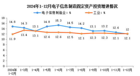 2024年,電子信息制造業(yè)固定資產(chǎn)投資同比增長(zhǎng)12%,較1-11月回落0.6個(gè)百分點(diǎn),比同期工業(yè)投資增速低0.1個(gè)百分點(diǎn),比同期高技術(shù)制造業(yè)投資增速高5個(gè)百分點(diǎn)。