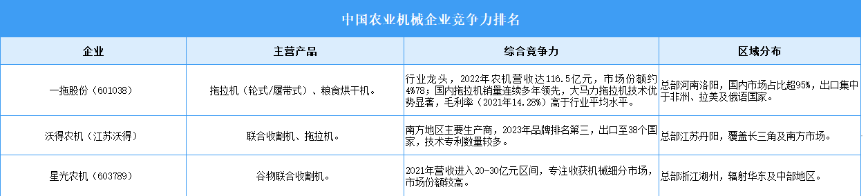 農(nóng)業(yè)機械是指在作物種植業(yè)和畜牧業(yè)生產(chǎn)過程中,以及農(nóng)、畜產(chǎn)品初加工和處理過程中所使用的各種機械。從競爭格局來看,一拖股份在拖拉機領(lǐng)域市場份額領(lǐng)先,但整體行業(yè)集中度仍低(中小企業(yè)占比高)。外資品牌(久保田、約翰迪爾)在高端市場占優(yōu),本土企業(yè)(一拖、雷沃)依托政策支持及本土化產(chǎn)品主導(dǎo)主流市場。江蘇省企業(yè)數(shù)量最多(林海股份、沃得農(nóng)機等),山東、河南為傳統(tǒng)農(nóng)機強省。
