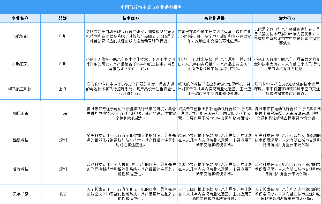 飛行汽車是指面向低空智能交通和立體智慧交通的載運工具,中國飛行汽車企業(yè)整體處于快速發(fā)展階段,技術(shù)積累和商業(yè)化進展各有側(cè)重。億航智能和小鵬匯天在自動駕駛和電動化領(lǐng)域具備明顯優(yōu)勢,峰飛航空科技和沃飛長空則在eVTOL領(lǐng)域表現(xiàn)突出。