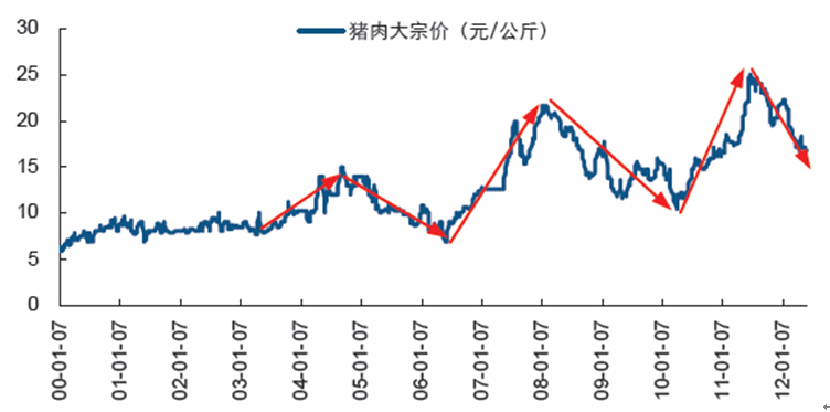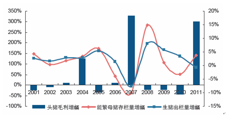 頭均盈利大幅上升通常會帶來生豬補(bǔ)欄積極性大幅提升,能繁母豬的存欄量和生豬出欄量的增幅峰值出現(xiàn)在頭均盈利的峰值后一年。由于母豬補(bǔ)欄領(lǐng)先于商品豬補(bǔ)欄,因此,能繁母豬的存欄量領(lǐng)先于生豬存欄量。