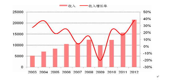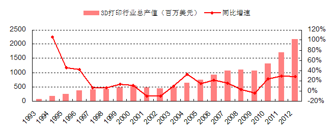 2012年,全球3D打印行業(yè)總產(chǎn)值約為22億美元,同比增長(zhǎng)28%;仡櫄v史,3D打印行業(yè)在上世紀(jì)90年代初曾經(jīng)出現(xiàn)過(guò)每年40%以上的高速增長(zhǎng),但隨后增速逐步趨于平緩;21世紀(jì)的前十年(2000-2009年),全球3D打印行業(yè)的年均復(fù)合增長(zhǎng)率僅為7.76%,互聯(lián)網(wǎng)泡沫后的2001-2002年,以及金融危機(jī)后的2009年,3D打印行業(yè)甚至出現(xiàn)了負(fù)增長(zhǎng);但是從2010年開(kāi)始,隨著3D打印技術(shù)的進(jìn)步以及個(gè)人需求的爆發(fā),3D打印行業(yè)再次進(jìn)入快速成長(zhǎng)期,最近三年(2010-2012)的年均復(fù)合增長(zhǎng)率超過(guò)27%。
