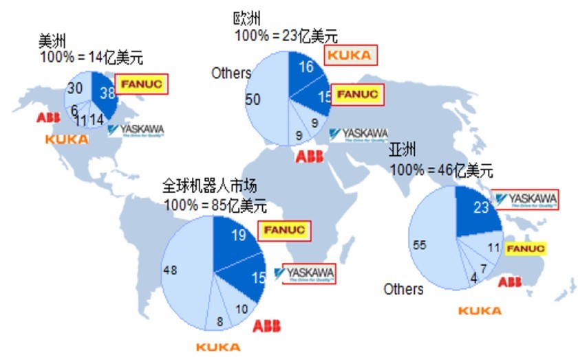 全球四大工業(yè)機(jī)器人巨頭在世界各大區(qū)域市場(chǎng)份額