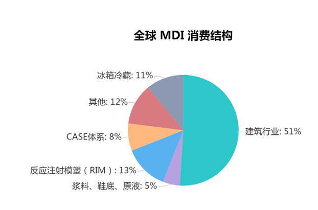 據(jù)中國建筑節(jié)能協(xié)會能耗統(tǒng)計專業(yè)委員會發(fā)布的數(shù)據(jù)顯示,2018年全國建筑過程碳排放量49.3億噸,占全國碳排放量的51.3%。建材生產(chǎn)碳排放量27.2億噸,占全國碳排放量的28.3%。在建筑運行階段碳排放量21.1億噸,占全國碳排放量21.9%。因此減少建筑能耗也是實現(xiàn)“碳中和”的必要途徑。國內(nèi)外已有共識,采用保溫隔熱材料是降低建筑能耗最經(jīng)濟有效的方法。就建筑材料而言,與其它保溫材料相比,聚氨酯材料具有更好的保溫性能,導(dǎo)熱系數(shù)只有0.024 W/(m• K),是一種非常理想的建筑保溫材料。聚氨酯主要原料是 MDI。冰箱冷藏占我國MDI下游消費的44%,建筑業(yè)僅占22%。而且在歐美等發(fā)達國家,在歐美等發(fā)達國家,聚氨酯已廣泛用于建筑業(yè)。MDI 在全球建筑業(yè)的平均比例達到了51%。相反,MDI在我國建筑領(lǐng)域的需求量很大,在“碳中和”的政策環(huán)境下,其應(yīng)用可能加速。