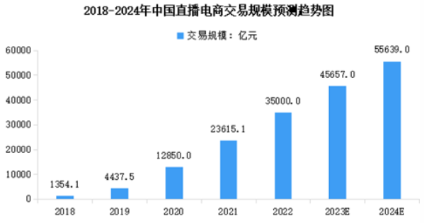直播電商作為一種新型的商業(yè)模式和商業(yè)業(yè)態(tài),在增加就業(yè)、擴大內(nèi)需、促進數(shù)字經(jīng)濟發(fā)展等方面發(fā)揮了積極作用。近年來,國內(nèi)直播電商行業(yè)保持快速發(fā)展趨勢。2022年中國中國直播電商交易規(guī)模達到35000億元,近五年年均復(fù)合增長率為125.48%。2023年中國直播電商交易規(guī)模將達到45657億元,2024年將達到55639億元。