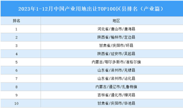 2023年1-12月全國(guó)產(chǎn)業(yè)用地出讓TOP100區(qū)(縣)排行榜已揭曉。據(jù)榜單顯示,2023年1-12月我國(guó)產(chǎn)業(yè)用地出讓面積前十區(qū)縣分別為:河北省/唐山市/唐?h、陜西省/榆林市/定邊縣、甘肅省/慶陽(yáng)市/環(huán)縣、陜西省/延安市/吳起縣、內(nèi)蒙古/鄂爾多斯市/準(zhǔn)格爾旗、山東省/濱州市/無(wú)棣縣、山東省/濱州市/沾化縣、內(nèi)蒙古/通遼市/扎魯特旗、吉林省/通化市/柳河縣、甘肅省/慶陽(yáng)市/華池縣。河北省/唐山市/唐?h產(chǎn)業(yè)用地出讓面積排名第一。