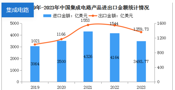 從進(jìn)出口情況來看,我國集成電路進(jìn)出口均出現(xiàn)同比下降趨勢,進(jìn)口的下降程度比出口更大。中商產(chǎn)業(yè)研究院數(shù)據(jù)庫顯示,2023年我國集成電路進(jìn)口數(shù)量為4795.6億個,同比下降10.8%,進(jìn)口金額為3493.77億美元,同比下降15.4%;出口數(shù)量為2678.3億個,同比下降1.8%,出口金額為1359.73億美元,同比下降10.1%。