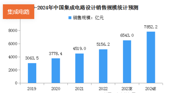 集成電路設(shè)計(jì)處于集成電路產(chǎn)業(yè)鏈的最前端,其設(shè)計(jì)水平直接決定了芯片的功能、性能及成本。依托國家政策的大力扶持、龐大的市場需求等眾多優(yōu)勢條件,我國的集成電路設(shè)計(jì)產(chǎn)業(yè)已成為全球集成電路設(shè)計(jì)市場增長的主要驅(qū)動力。2022中國集成電路設(shè)計(jì)行業(yè)銷售額為5156.2億元,同比增長14.1%。2023年中國集成電路設(shè)計(jì)行業(yè)銷售額將達(dá)到6543億元,2024年將增至7852.2億元。