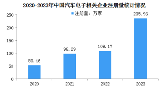 目前,我國約有693.25萬家汽車電子相關(guān)企業(yè)。2020年以來,汽車電子企業(yè)注冊大爆發(fā),相關(guān)企業(yè)年注冊量均在50萬家以上。企查查數(shù)據(jù)顯示,2023年汽車電子新注冊企業(yè)超200萬家,同比增長116.1%。
