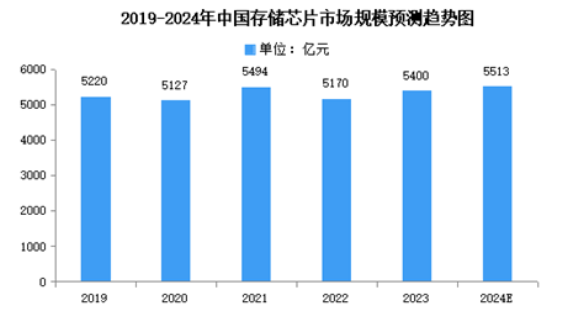 受消費電子市場需求疲軟等因素影響,自2021年以來,存儲芯片產(chǎn)業(yè)進入長達近兩年的下行周期。2022年,我國存儲芯片市場規(guī)模約5170億元,同比下降5.9%,2023年市場規(guī)模約為5400億元。當前新一輪人工智能浪潮爆發(fā),由AI服務器帶來存儲芯片新的增量需求, 2024年市場規(guī)模將恢復增長至5513億元。