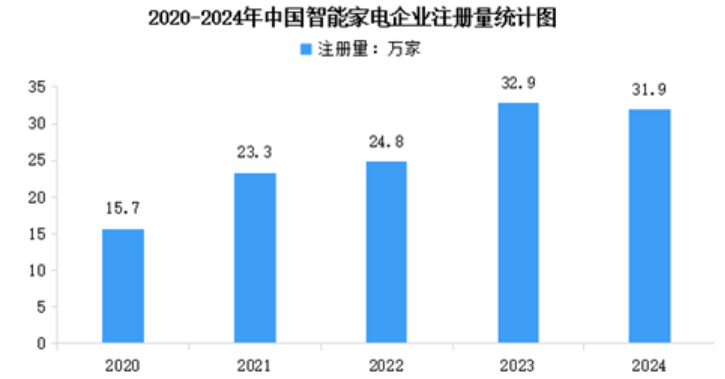 國家出臺的“以舊換新”等政策,對智能家電市場的復(fù)蘇和企業(yè)的發(fā)展起到了積極的推動作用,激勵了消費(fèi)者的購買熱情,也為企業(yè)注入了發(fā)展的動力。根據(jù)企查查數(shù)據(jù),截至 2025年2月底,中國智能家電相關(guān)企業(yè)總量達(dá)到184.46萬家。2023年全年新增注冊量同比大幅增長32.56%,達(dá)到32.9萬家,創(chuàng)下了近五年來的新高。
