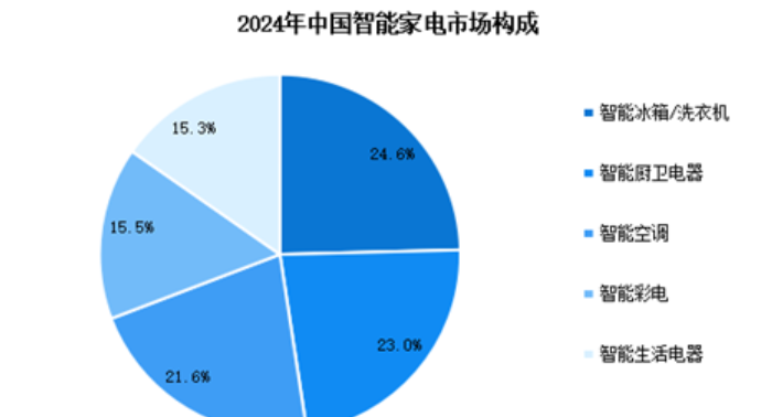 隨著智能家電產品逐漸獲得消費者的認可與青睞,越來越多的廠商將布局智能家電領域,不斷創(chuàng)新產品供給,為市場提供更為豐富多樣的智能家電產品來滿足消費者日益增長的消費需求。按零售額,2024年智能冰箱/洗衣機市場占比最大,為24.6%,智能廚衛(wèi)電器和智能空調分別占比23.0%和21.6%,智能彩電和智能生活電器分別占比15.5%和15.3%。