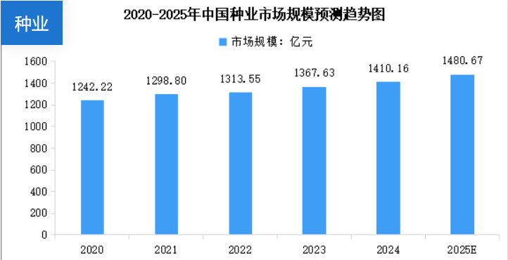 隨著全球以“生物技術(shù)+信息化”為特征的種業(yè)科技革命的興起和我國農(nóng)業(yè)現(xiàn)代化的加速推進(jìn),種業(yè)在農(nóng)業(yè)發(fā)展中的基礎(chǔ)性、戰(zhàn)略性、先導(dǎo)性、引領(lǐng)性地位日益突出。2024年中國種業(yè)市場規(guī)模達(dá)到1410.16億元,同比增長3.11%。2025年中國種業(yè)市場規(guī)模將達(dá)到1480.67億元。