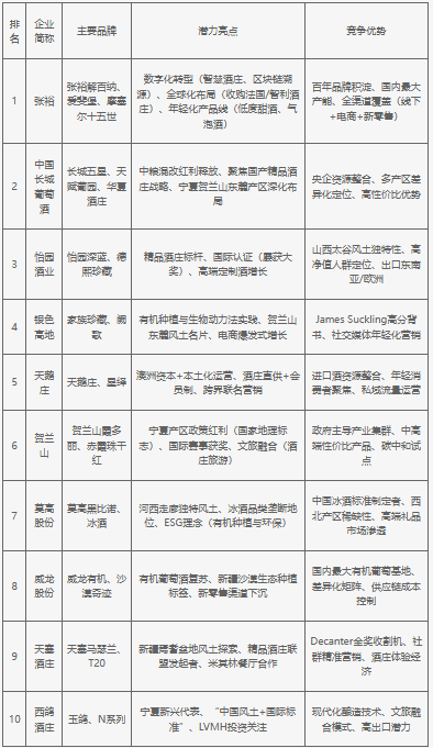 2025年中國葡萄酒行業(yè)最具發(fā)展?jié)摿ζ髽I(yè)主要包括張裕、中國長城葡萄酒、怡園酒業(yè)、銀色高地、天鵝莊、賀蘭山、莫高股份、威龍股份、天塞酒莊、西鴿酒莊。頭部企業(yè)如張裕、長城依托品牌積淀與規(guī)模優(yōu)勢加速轉(zhuǎn)型(數(shù)字化、全球化),而精品酒莊(怡園、銀色高地等)則通過風土特色、國際認證搶占高端市場。新興勢力(西鴿、天塞)以產(chǎn)區(qū)政策與資本關(guān)注快速崛起。