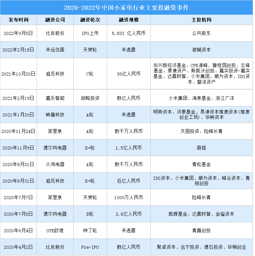 隨著家電行業(yè)智能化的興起,小家電作為智能家居領域的重要組成部分,逐漸成為投資者關注的領域,目前投資事件相對較少。2021年投資數(shù)量為6起,投資金額達歷史最高,為39.54億元。其中,主營無線吸塵器、掃地機器人、洗地機等家居小家電產品的“追覓科技”獲得由中信產業(yè)基金CPE源峰領投的36億元人民幣的C輪融資。2022年,主營從事加熱類廚房電器產品的“比依股份”成功IPO上市,融資約5.8億元。此外,主營水家電的礦泉機品牌“家里泉”、主營廚房小家電的“OTE歐堤”等都獲得了多輪投資。