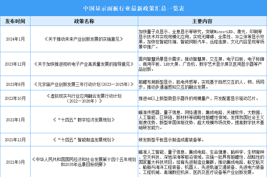 近年來,中國顯示面板產(chǎn)業(yè)受到各級(jí)政府的高度重視和國家產(chǎn)業(yè)政策的重點(diǎn)支持。國家陸續(xù)出臺(tái)了《關(guān)于推動(dòng)未來產(chǎn)業(yè)創(chuàng)新發(fā)展的實(shí)施意見》《關(guān)于加快推進(jìn)視聽電子產(chǎn)業(yè)高質(zhì)量發(fā)展的指導(dǎo)意見》《新產(chǎn)業(yè)標(biāo)準(zhǔn)化領(lǐng)航工程實(shí)施方案(2023─2035年)》等多項(xiàng)政策,鼓勵(lì)顯示面板行業(yè)發(fā)展與創(chuàng)新,為企業(yè)提供了良好的生產(chǎn)經(jīng)營環(huán)境。具體政策如下: