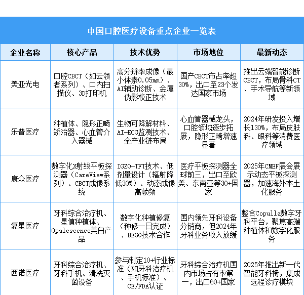 國產(chǎn)口腔CBCT已從“價格戰(zhàn)”轉(zhuǎn)向“技術(shù)戰(zhàn)”,通過核心部件自主化、低劑量成像、多合一集成等創(chuàng)新,實現(xiàn)從“國產(chǎn)替代”到“技術(shù)輸出”的跨越,主要廠商包括美亞光電、朗視儀器、菲森科技、博恩登特等。