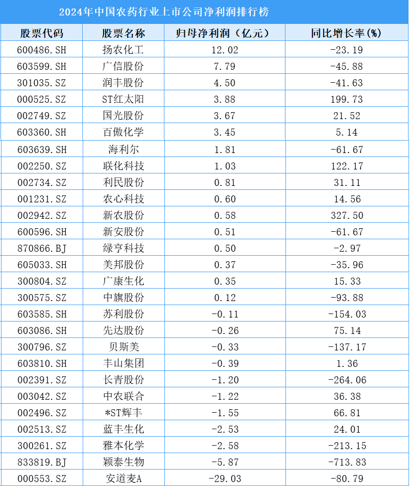32家農(nóng)藥行業(yè)上市公司公布了2024年經(jīng)營情況。其中,21家上市公司盈利,11家歸母凈利潤出現(xiàn)虧損。