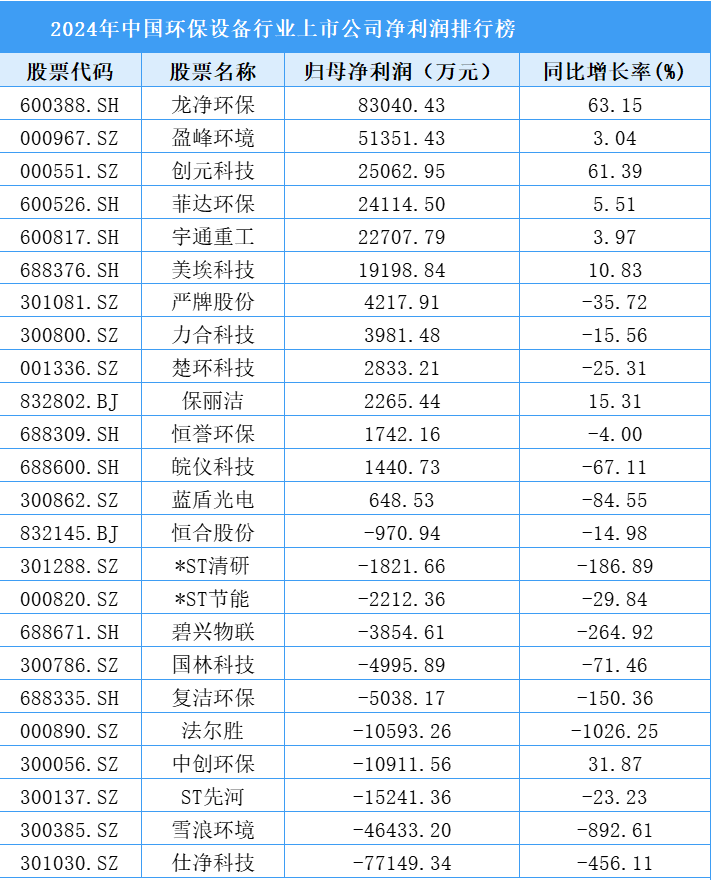 2024年中國環(huán)保設(shè)備行業(yè)凈利潤TOP10企業(yè)分別為龍凈環(huán)保、盈峰環(huán)境、創(chuàng)元科技、菲達(dá)環(huán)保、宇通重工、美?萍、雪迪龍、盛劍科技、亞光股份、青達(dá)環(huán)保。龍凈環(huán)保歸母凈利潤最高達(dá)8.30億元。