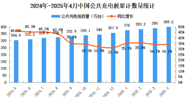 截至2025年4月,公共充電樁保有量399.2萬臺(tái),環(huán)比增加9.2萬臺(tái),同比增長34.1%。其中直流充電樁183.4萬臺(tái)、交流充電樁215.7萬臺(tái)。從2024年5月到2025年4月,月均新增公共充電樁約8.5萬臺(tái)。