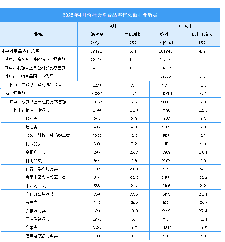 4月份,社會(huì)消費(fèi)品零售總額37174億元,同比增長(zhǎng)5.1%。其中,除汽車以外的消費(fèi)品零售額33548億元,增長(zhǎng)5.6%。1—4月份,社會(huì)消費(fèi)品零售總額161845億元,增長(zhǎng)4.7%。其中,除汽車以外的消費(fèi)品零售額147005億元,增長(zhǎng)5.2%。