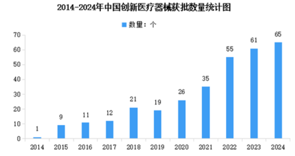 創(chuàng)新醫(yī)療器械是指具有產(chǎn)品核心技術(shù)發(fā)明專利權(quán)、基本定型、國際領(lǐng)先水平和顯著臨床應(yīng)用價值的醫(yī)療器械。2024年,國家藥監(jiān)局共批準創(chuàng)新醫(yī)療器械65個,涉及支氣管導航操作控制系統(tǒng)、眼底病變眼底圖像輔助診斷軟件、體外心室輔助設(shè)備、腎動脈射頻消融儀等多款高端醫(yī)療器械,涵蓋手術(shù)機器人、人工智能醫(yī)療器械、心肺支持輔助系統(tǒng)等多領(lǐng)域。創(chuàng)新醫(yī)療器械已成為醫(yī)療產(chǎn)業(yè)升級的核心引擎,在政策扶持、技術(shù)突破與市場需求的共振下,中國正從“跟跑”向“并跑”乃至“領(lǐng)跑”轉(zhuǎn)變。