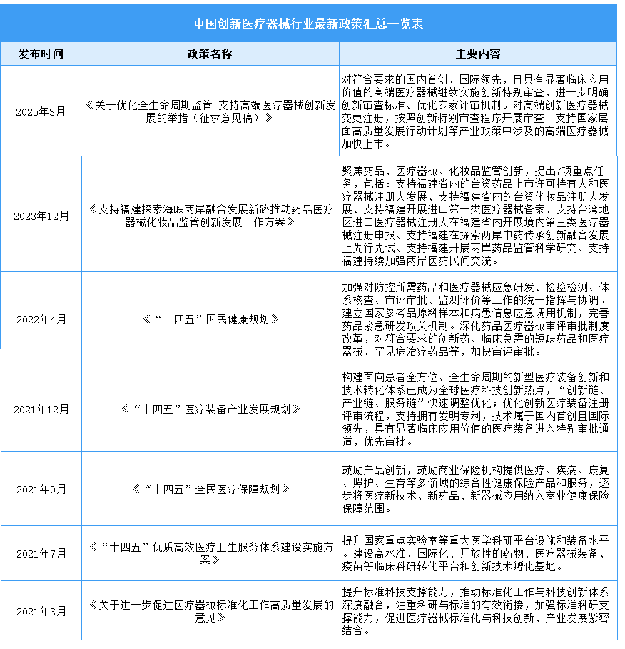 醫(yī)療器械作為現(xiàn)代醫(yī)療衛(wèi)生體系建設(shè)的重要支柱之一,具有高度的戰(zhàn)略性、帶動性和成長性,我國高度重視醫(yī)療器械產(chǎn)業(yè)的創(chuàng)新發(fā)展,主管部門出臺多項(xiàng)政策鼓勵(lì)國產(chǎn)醫(yī)療器械加快創(chuàng)新、推動高端醫(yī)療器械國產(chǎn)化,促進(jìn)新技術(shù)的推廣和應(yīng)用,推動國內(nèi)醫(yī)療器械產(chǎn)業(yè)的快速發(fā)展。在相關(guān)政策的支持下,我國創(chuàng)新醫(yī)療器械產(chǎn)品加快涌現(xiàn),行業(yè)進(jìn)入高質(zhì)量發(fā)展階段。