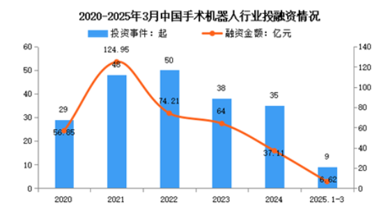 手術(shù)機(jī)器人市場(chǎng)中,盡管國(guó)內(nèi)面臨商業(yè)化阻力,但政策支持與技術(shù)突破為行業(yè)注入動(dòng)能,頭部企業(yè)如微創(chuàng)機(jī)器人通過海外裝機(jī)拓展市場(chǎng)。IT桔子數(shù)據(jù)顯示,2024年中國(guó)手術(shù)機(jī)器人已披露投資事件共35起,已披露融資金額約37.11億元。2025年1-3月手術(shù)機(jī)器人已披露投資事件共9起,已披露融資金額約6.62億元。