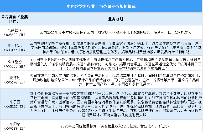 中國軟飲料行業(yè)上市公司2025年業(yè)務(wù)規(guī)劃聚焦業(yè)績增長、市場拓展、產(chǎn)品創(chuàng)新與品牌強化、運營管理優(yōu)化等措施,通過多舉措提升競爭力、挖掘市場潛力。