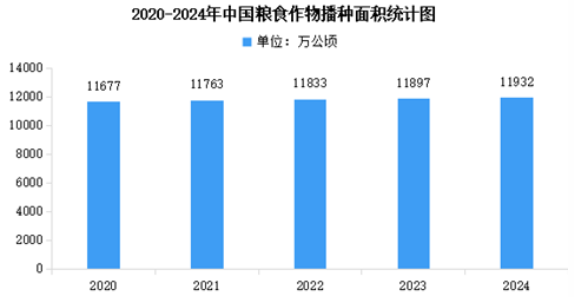2024年,全國(guó)糧食播種面積11932萬(wàn)公頃,比上年增加35萬(wàn)公頃。其中,稻谷播種面積2901萬(wàn)公頃,增加6萬(wàn)公頃;小麥播種面積2359萬(wàn)公頃,減少4萬(wàn)公頃;玉米播種面積4474萬(wàn)公頃,增加52萬(wàn)公頃;大豆播種面積1033萬(wàn)公頃,減少15萬(wàn)公頃。棉花播種面積284萬(wàn)公頃,增加5萬(wàn)公頃。油料播種面積1429萬(wàn)公頃,增加37萬(wàn)公頃。糖料播種面積148萬(wàn)公頃,增加7萬(wàn)公頃。