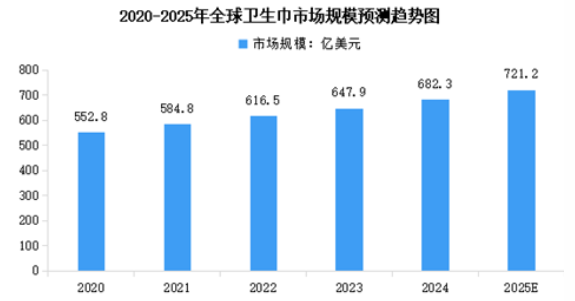 隨著女性健康意識(shí)不斷增強(qiáng),對(duì)衛(wèi)生巾的品質(zhì)和安全性要求更高,高端、環(huán)保、功能化產(chǎn)品占比逐年提升,全球衛(wèi)生巾行業(yè)市場(chǎng)規(guī)模不斷擴(kuò)大。2024年全球衛(wèi)生巾市場(chǎng)規(guī)模達(dá)到682.3億美元,較上年增長(zhǎng)5.3%。2025年全球衛(wèi)生巾市場(chǎng)規(guī)模將增至721.2億美元。