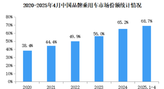2025年1-4月,中國品牌乘用車共銷售594萬輛,同比增長27.4%,占乘用車銷售總量的68.7%,銷量占有率比上年同期提升8.1個百分點(diǎn)。