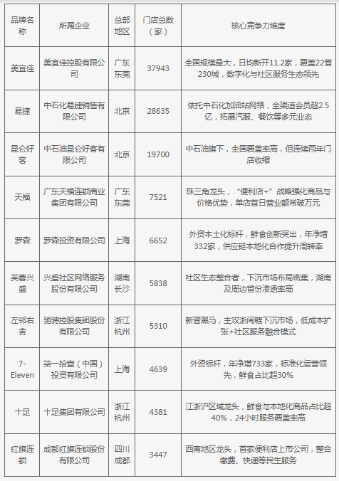 便利店是一種小型零售業(yè)態(tài),它在滿足人們?nèi)粘I畋憷孕枨蠓矫姘l(fā)揮著重要作用。我國(guó)便利店行業(yè)競(jìng)爭(zhēng)激烈,Top10品牌門店總數(shù)124066家,占Top100總門店數(shù)的63%。其中,美宜佳門店數(shù)量37943家,市場(chǎng)份額占比19.3%,位居第一。外資品牌中,羅森以本土化策略穩(wěn)居前五,7-Eleven標(biāo)準(zhǔn)化運(yùn)營(yíng)實(shí)現(xiàn)爆發(fā)增長(zhǎng)。本土品牌中,天福、左鄰右舍通過區(qū)域深耕和低成本擴(kuò)張快速崛起。